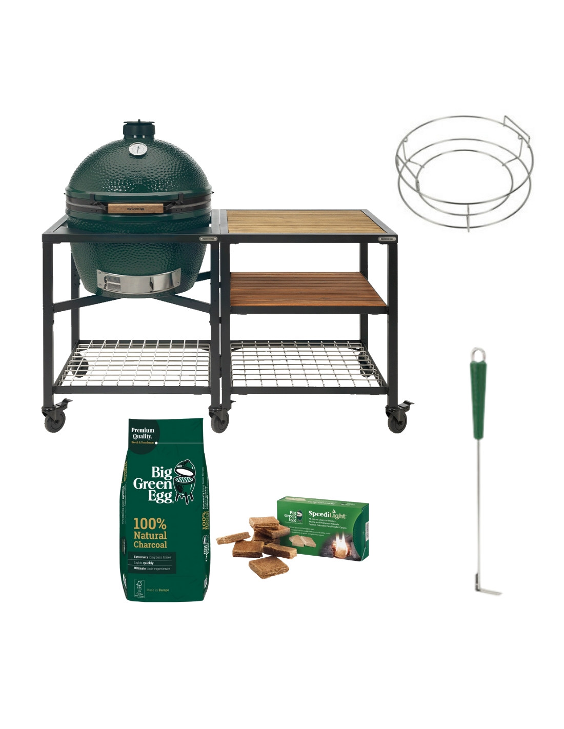 Pack Big Green Egg XLarge sur table modulaire + module 3 étagères acacia : 300 € d’accessoires offerts et rangement ultra-pratique !